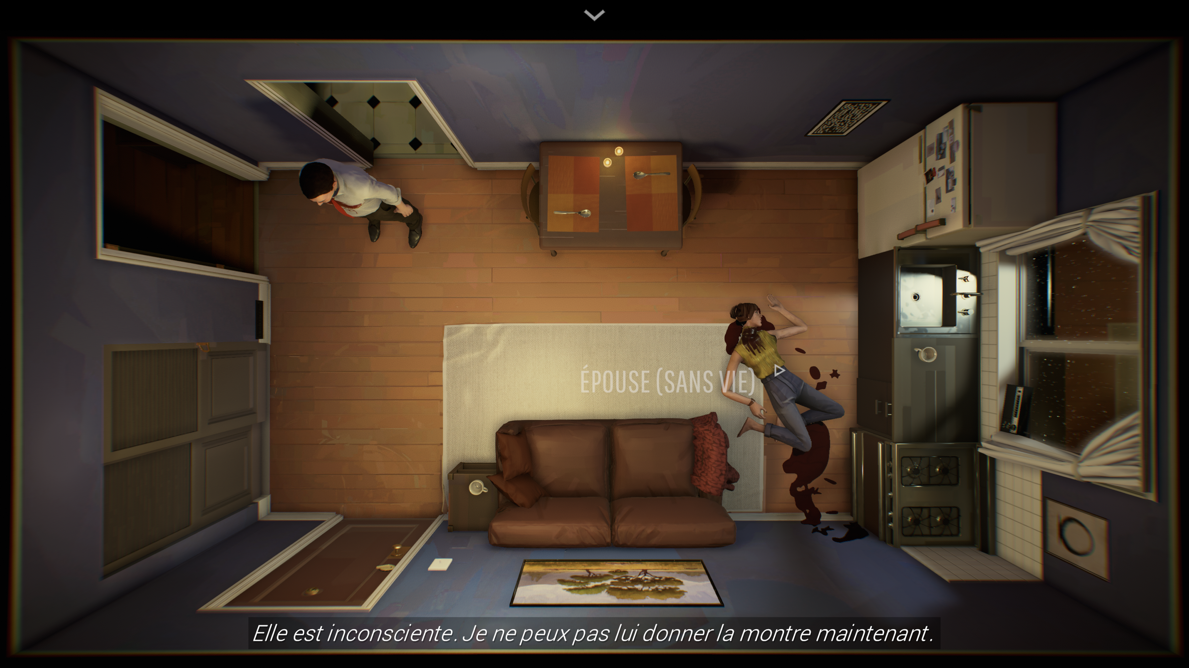 Le problème de 12 Minutes tient donc autant à son scénario qu’à son plot twist tiré par les cheveux mais aussi à l’obligation de subir véritablement ces incessants retours nous mettant systématiquement face à la même scène. Un simple baiser de votre femme ne sera alors plus vu comme un geste d’amour (pourtant important puisque le but est de sauver votre bien aimée) mais comme un élément de game design, impossible à éviter et nous faisant perdre quelques secondes alors qu’on sera déjà dans une logique, bien plus pragmatique, de recherches d’indices. Le bruit caractéristique de l’ascenseur arrivant à notre étage, et donc synonyme de l’arrivée du policier, passera d’un gimmick anxiogène à un élément nous renseignant simplement sur le fait qu’il nous reste quelques secondes pour faire telle ou telle tâche, aborder tel ou tel sujet. Certes, il est possible d’accélérer les dialogues déjà abordés ou même le temps (en allant se coucher sur notre lit) mais malgré cela, 12 Minutes perd rapidement de son attrait.