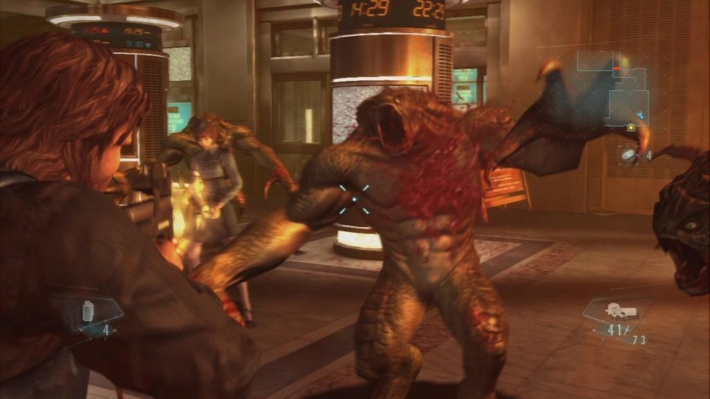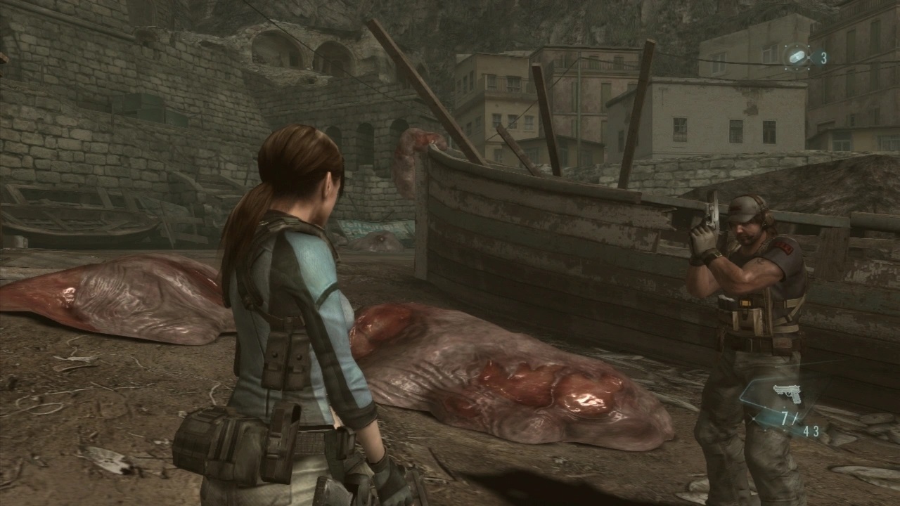 Concernant la maniabilité, on profite cette fois de la souplesse du second stick sur consoles de salon. De fait, si la jouabilité de base reste plutôt convaincante, du moins pour un Resident Evil, on a du mal à s’y faire après Resident Evil 6 qui avait énormément apporté en termes de réactivité. Calquée sur celle de Resident Evil 5, la jouabilité de Revelations permet toutefois de bouger en tirant ou d’effectuer des esquives rapides. Au rayon des écueils, mentionnons le soutien peu convaincant de notre compagnon de route. En effet, on se rend vite compte que si ce dernier shoote à tout va, sa puissance de feu n’a rien à voir avec la nôtre, le gugusse n’arrivant que rarement à éliminer un adversaire lambda malgré des dizaines de balles dans le buffet. Un peu frustrant et rendant l’idée de coopération virtuelle caduque, hormis pour faire avancer le scénario.