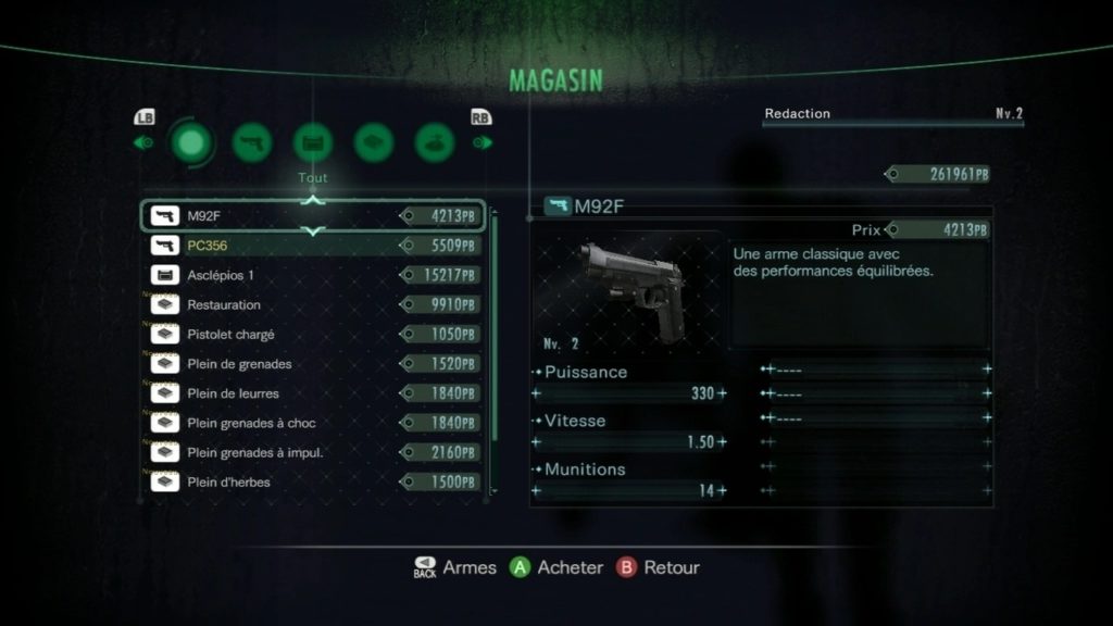Pourtant, comme précisé un peu plus haut, ces va-et-vient entre les binômes nous permettront de visiter de nouveaux lieux et de changer de configurations d’armes, les différents agents débutant chaque séquence avec leur propre matos. Retenez quand même que dans la dernière ligne droite, vous aurez normalement accès à l’ensemble des pétoires si tant est que vous les ayez dénichées. Magnum, fusil à pompe, mitraillettes, lance-missiles, du conventionnel pour qui a déjà touché à un Resident même si on aura cette fois droit à une grenade électrique bien utile pour se débarrasser de la poiscaille mutante ou bien encore un leurre biologique attirant tous les ennemis alentour avant d’exploser. Veuillez également noter qu’il sera possible de customiser vos armes en récupérant des kits un peu partout. Ensuite, il ne restera plus qu’à trouver une malle où vous pourrez ranger vos bébés mais aussi améliorer leur cadence de tir, puissance de feu, rechargement… De plus, sachez que si d’aventure, vous trouviez une arme sur votre route, celle-ci prendrait la place d’une autre qui irait automatiquement dans une malle. Peu crédible mais pratique vu qu’il nous est possible de ne porter que trois pétoires à la fois en plus d’un lot de grenades et du traditionnel couteau.