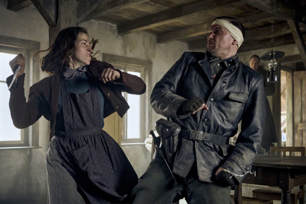 On aurait alors pu s’attendre à une critique du régime nazi à travers une réjouissante satire mais ici aussi, cet aspect s’avère léger puisque cantonné à quelques dialogues (notamment en rapport au frère handicapé d’Elsa), personnages (le commandant allemand et son alliance cachée à l’intérieur de son oeil) ou aux pillages des nazis à la fin de la guerre. Frustrant donc, même si d’un point de vue formel, Peter Thorwarth opte pour une approche intéressante, se revendiquant du film de guerre et du western autant dans ses sales trognes que le lieu de l’action ou sa bande-son. Si on retiendra également une photo très homogène, assez fade, les scènes d’action filmées en grand angle, s’avèrent lisibles, bien chorégraphiées même si elles restent assez timorées malgré quelques idées et plans bien gores.