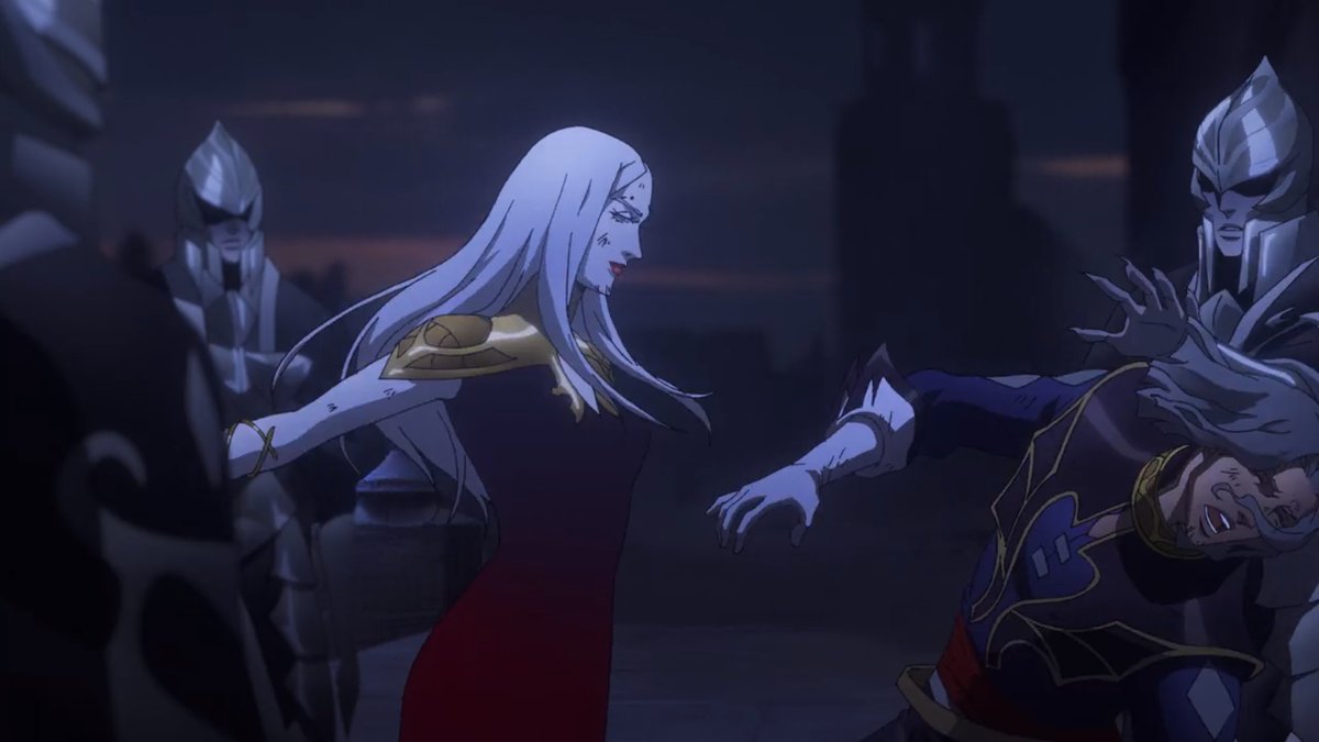 Il est tout à fait plaisant de découvrir la cour de Dracula d’autant qu’au delà de la promesse d’affrontements à venir (ceux-ci ayant lieu notamment dans l’épisode 7), trois personnages sortent clairement du lot tant dans leur psychologie que les trahisons qu’ils fomentent dans l’ombre. Hector, chétif forgeron hors pair ayant la capacité de ramener les morts à la vie, forme ainsi un étrange duo avec Isaac, seuls humains au milieu d’une légion de vampires, ce qui n’est pas vraiment du goût du suceur de sang Godbrand. Si de ce postulat naît rapidement des querelles intestines au sein du groupe, l’arrivée de Camilla accentue cet état de faits en plantant la graine de la trahison au sein des proches de Dracula. La vampire n’étant pas femme à se laisser dominer par la gente masculine, elle ne tardera pas à comploter contre le comte. Bien que son arrivée fracassante ne laisse planer aucun doute sur sa nature et ses intentions, elle n’en reste pas moins un personnage fort, seule femme dans un univers d’hommes, usant aussi bien de ses charmes que de sa force pour parvenir à ses fins.