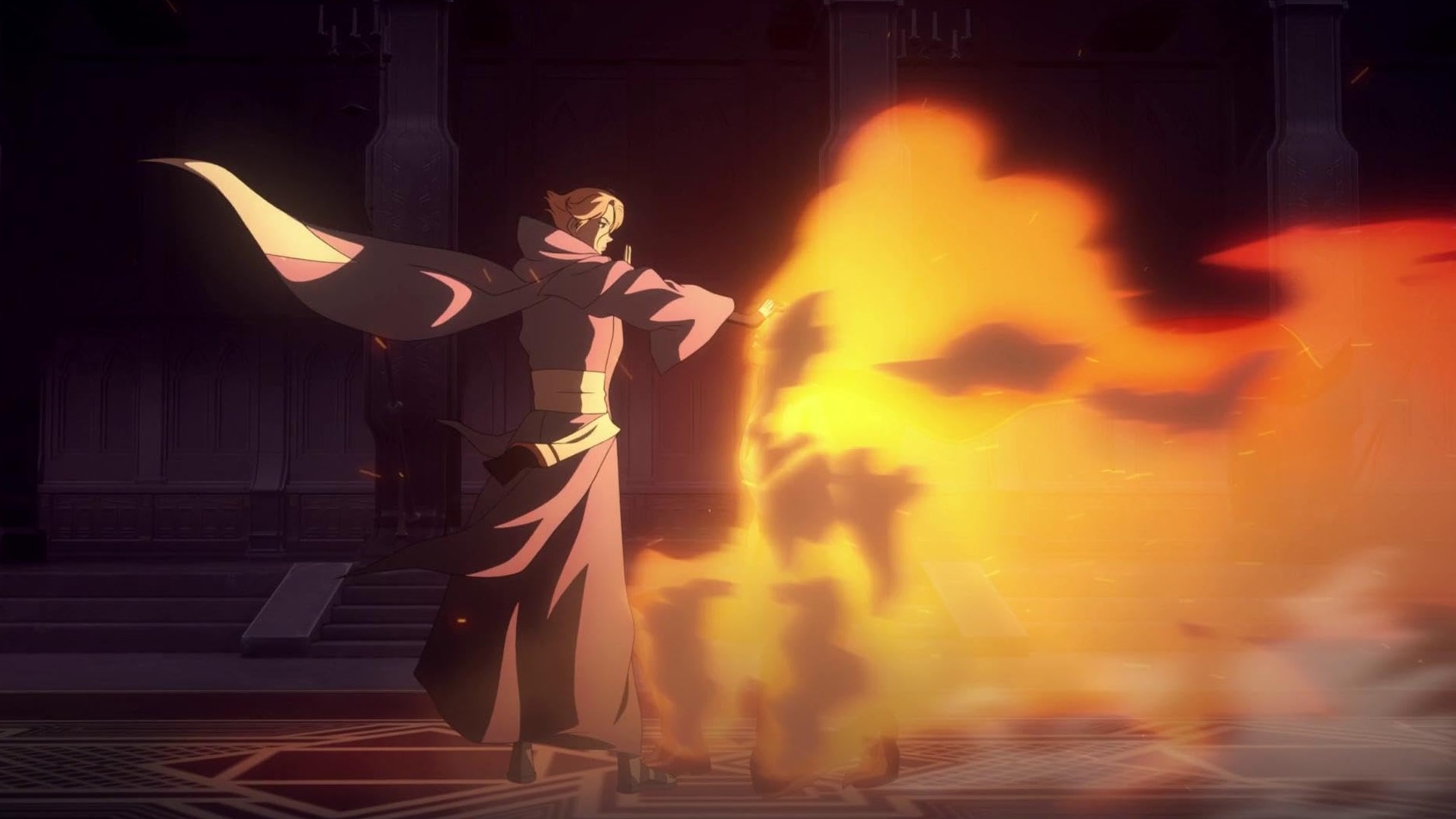 Face à elle, Hector et Isaac semblent donc démunis. Ce serait vite oublier l’importance de ces deux humains pour Dracula, le premier étant à même de fournir une armée bon marché grâce à ses talents, le second s’avérant un ancien esclave au passé douloureux, oscillant désormais entre expiation et dévouement total au comte. Chacun profitant de flashbacks aussi courts qu’intenses, on apprend vite à les cerner et à s’intéresser à eux, à leur personnalité et à leur rôle futur au sein de cette guerre se préfigurant entre deux clans que tout oppose. Alors que le format court n’aide pas vraiment à développer l’intrigue, ce n’est en rien préjudiciable à la série, Trevor, Sypha et Alucard continuant leur périple en parallèle de la présentation des forces ennemies. Leur objectif étant connu dès le départ (atteindre le château du vampire), la série s’en émancipe rapidement pour privilégier les Forces obscures. L’équilibre est donc mieux maîtrisé que dans la première saison d’autant que les conversations dispendieuses laissent ici place à des échanges verbaux ayant principalement vocation à donner plus de poids à l’univers (ou ses protagonistes), toujours aussi sombre, sanglant et mettant aux prises un être damné face à une Eglise prompte à condamner une fois de plus ce qu’elle ne comprend pas ou qu’elle rejette fermement.