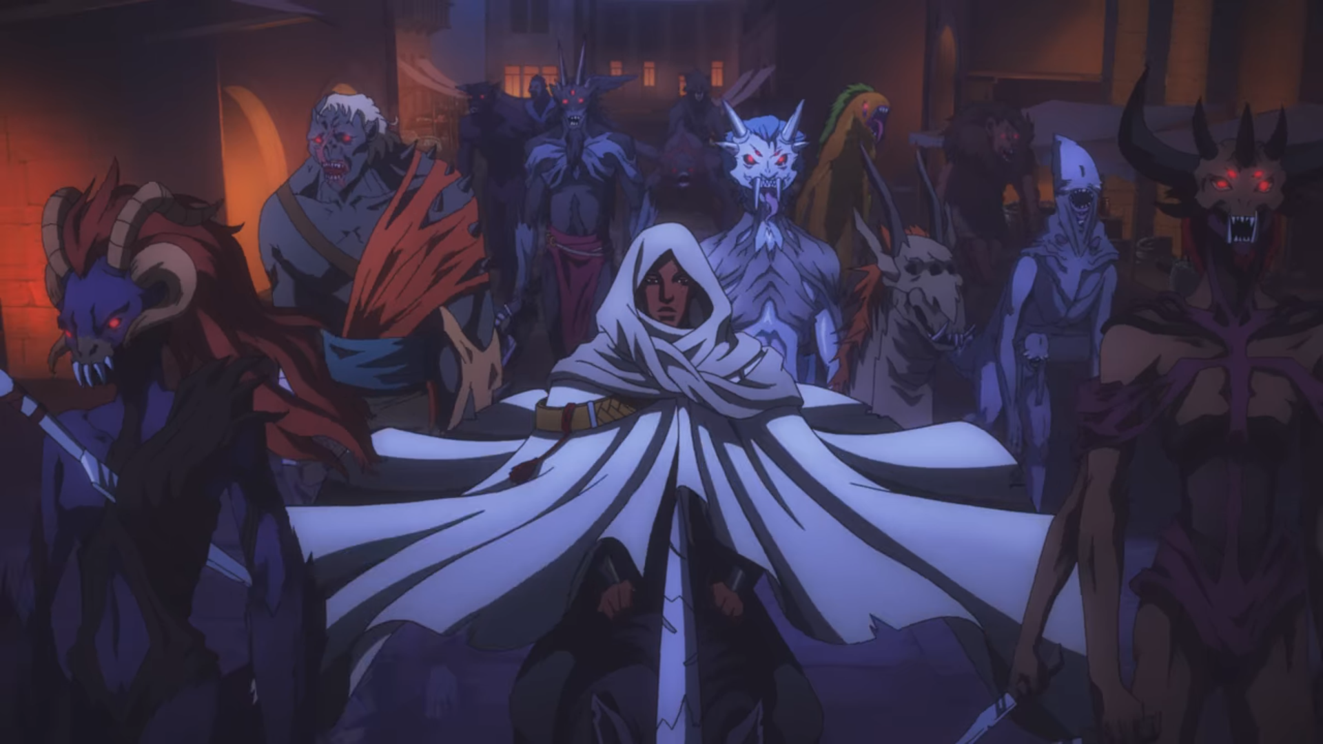 Après nous avoir présenté les Forces du Bien lors de la première saison puis celles des Ténèbres dans la deuxième, la Saison 03 suit logiquement l’un comme l’autre groupe en optant pour une narration découpée en quatre histoires se déroulant en parallèle les unes des autres. Une décision intéressante et permettant dès le départ à cette nouvelle salve d’épisodes de proposer des ambiances, lieux et intrigues différents et complémentaires. Puisant ses influences aussi bien dans Castlevania : Curse of Darkness que dans le folklore gothique, cette nouvelle saison marie les atmosphères en nous faisant passer d’un village recelant un bien étrange mystère au château de Dracula où Alucard entend bien découvrir, en compagnie de Taka et Sumi (ses deux récents protégés et accessoirement chasseurs de vampires), les trésors que le lieu abrite. Pendant ce temps, Isaac poursuit sa route en créant sa propre armée de démons afin de venir à bout de Carmilla et ses sœurs dont Leonore se montre sans doute le membre le plus intéressant, douce et compatissante en apparence, perverse et calculatrice dans le fond. Bien qu’on ne doute pas vraiment que tout ce beau monde se retrouvera pour le grand final, la Saison 03 s’accorde du temps pour creuser à nouveau les différents personnages à l’image de Trevor et Syphas formant un joyeux petit couple, aussi uni dans l’adversité que dans des moments de complicité saupoudrés d’humour. Evoluant à travers le village de Lindenfeld, nos deux héros ne tarderont pas à s’allier à Saint Germain, voyageur enquêtant lui aussi sur les agissements du Juge, «maire» du village, et ceux de Sala, leader d’un groupe de moines dont la mission première ne semble pas des plus catholiques. Débutant de façon assez classique, l’intrigue de Lindenfeld ne tarde pas à prendre de l’ampleur en intégrant notamment un aspect inter-dimensionnel synonyme d’une séquence hallucinée plutôt réussie mélangeant animation traditionnelle et éléments 3D.