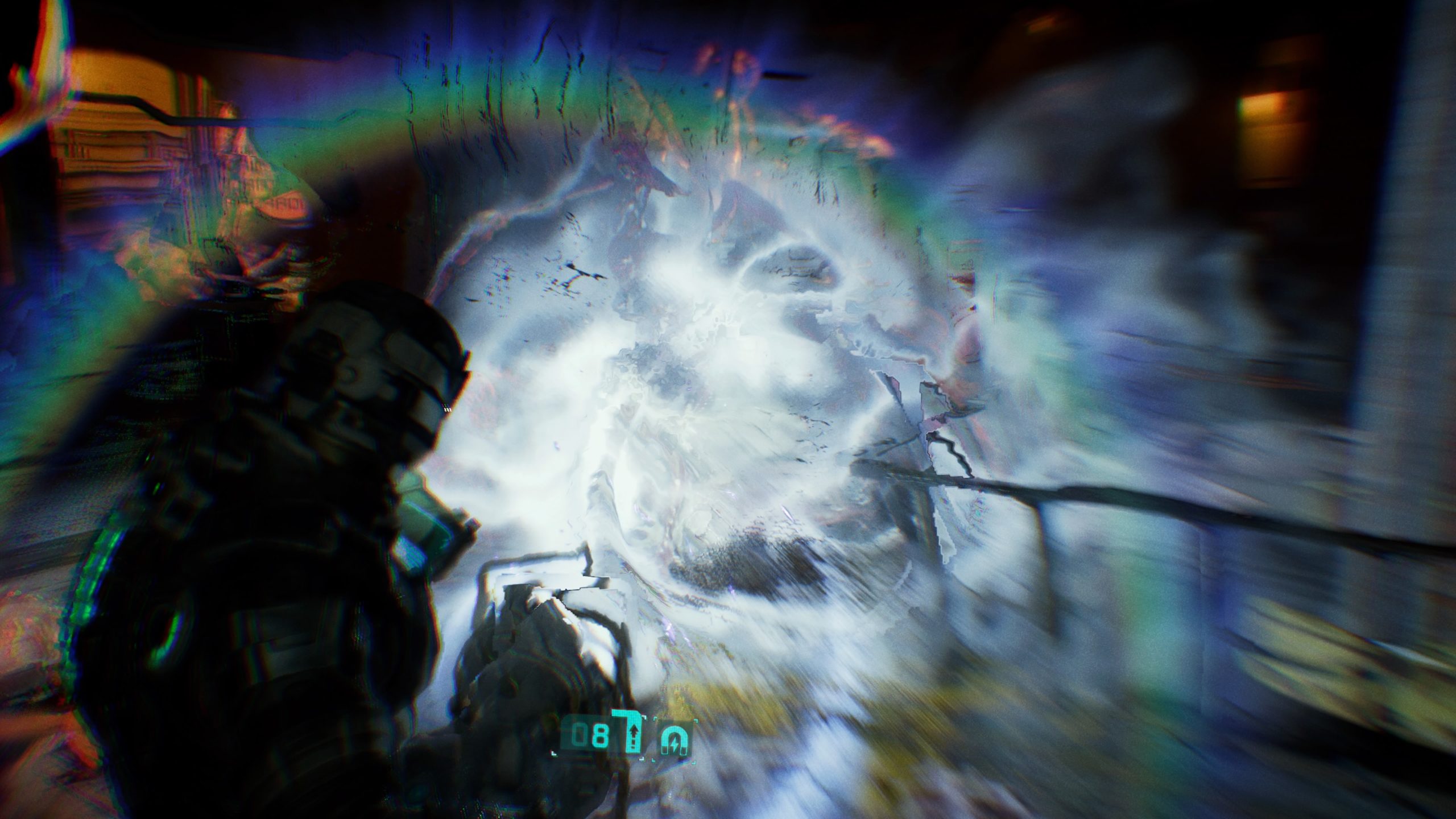 Le gameplay, lui, ne s’offre aucune réelle nouveauté et profite au mieux d’une plus grande liberté permettant de visiter à sa guise l’Ishimura. Ainsi, bien que l’aventure soit toujours découpée en chapitres, rien ne vous empêchera de revenir dans n’importe quelle section du vaisseau pour récupérer les collectibles manquants ou boucler les quêtes secondaires mentionnées plus haut. On saluera toutefois quelques passages repensés à l’image de la séquence des météorites à intercepter se déroulant ici à l’extérieur et demandant au joueur de recalibrer trois canons en visant les débris spatiaux. La possibilité de voler en Zéro G, ici plus centrale, permet également de se sentir plus libre, autant dans la façon d’explorer que lors des affrontements afin de prendre la tangente pour mieux anticiper une attaque de Nécromorphes voire l’intercepter grâce à la Stase ou les nombreuses armes à disposition toujours aussi complémentaires et délicieuses à manier grâce un excellent feeling ici aussi renforcé par un traitement sonore de haute volée.