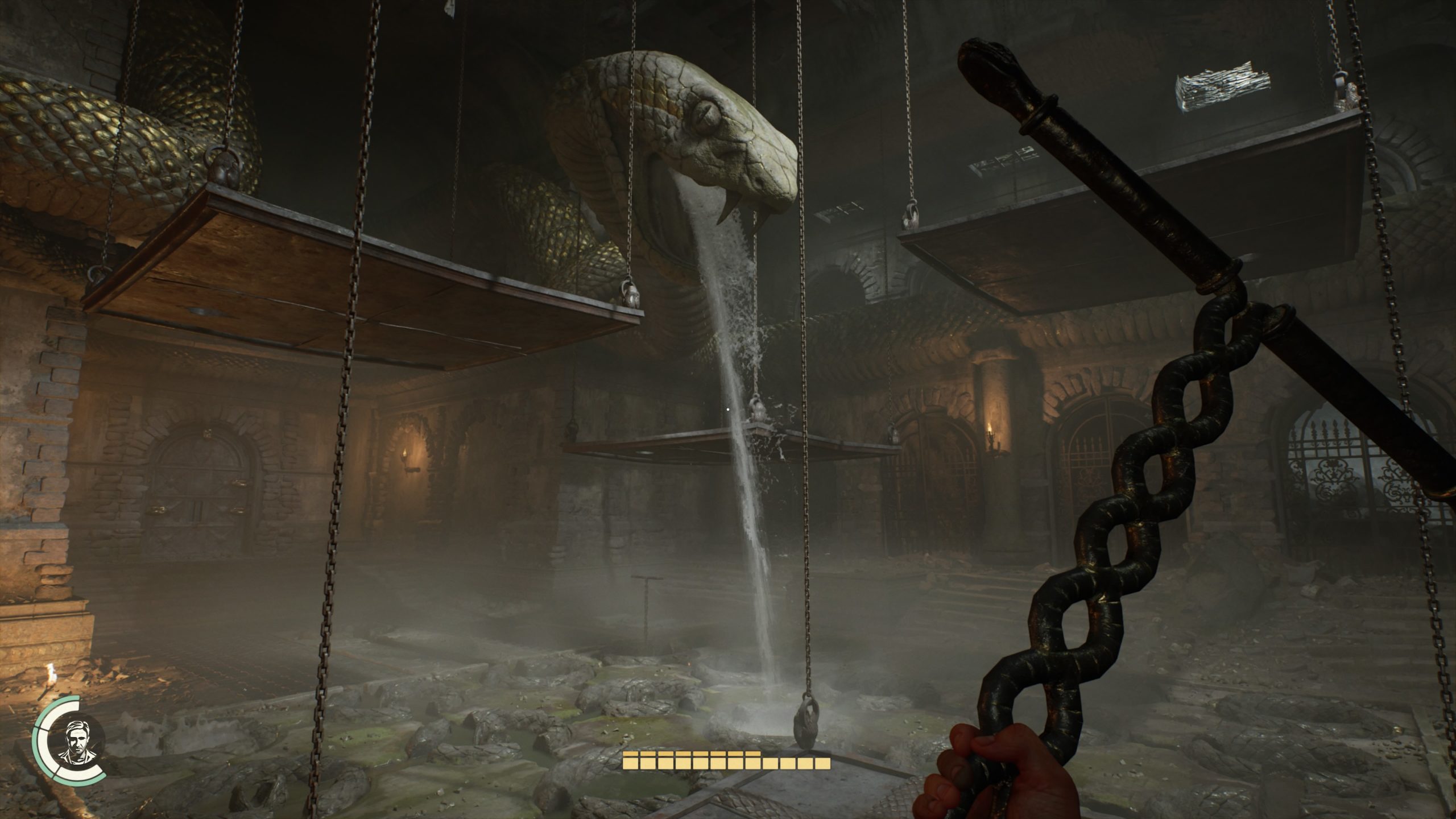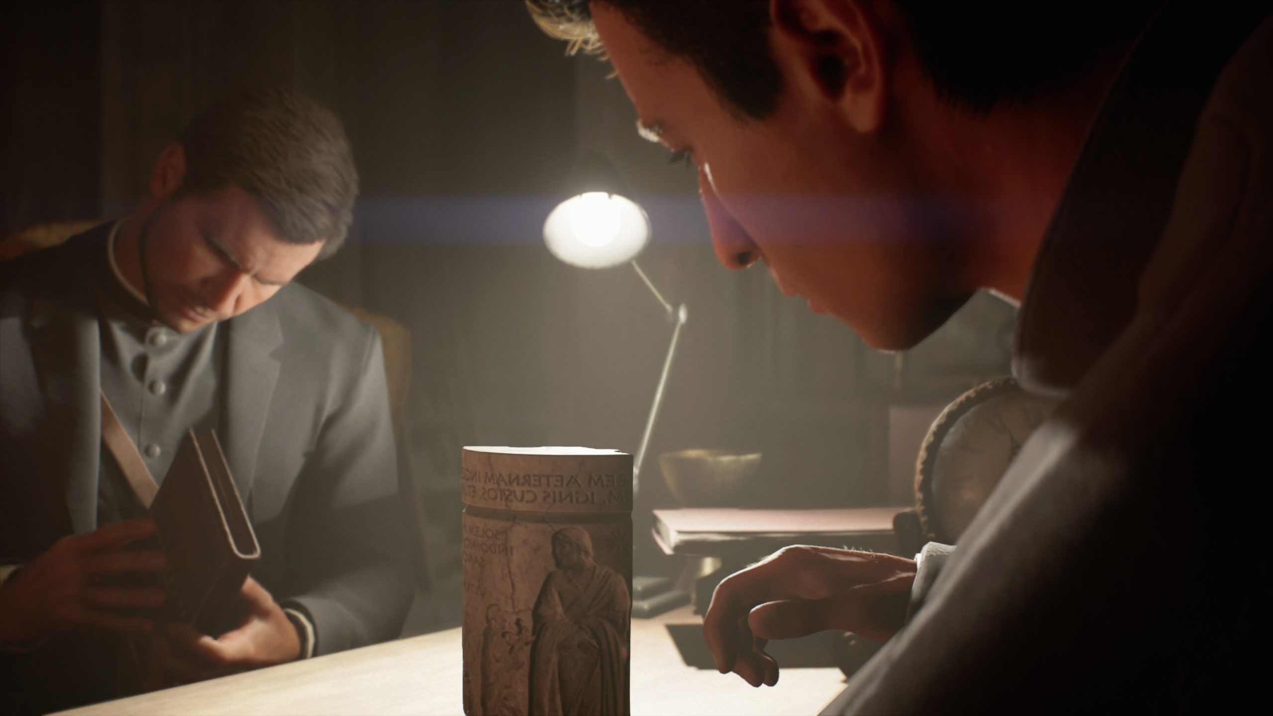 De fait, plus on avance dans ce contenu et plus le scénario se délaye au profit de le l’exploration, de l’action et de la réflexion à travers plusieurs puzzles toujours aussi bien pensés. Malheureusement, certains d’entre eux s’avèrent assez agaçants à cause d’un gameplay mal pensé, écueil qu’on trouvait déjà dans le jeu de base. Plus qu’un long discours, prenons l’exemple de l’énigme du Croisé nous demandant de reconstituer des scènes en tournant des mécanismes sphériques. Chaque scène étant associée à un document qu’on a dans notre inventaire, on devra, tout au long de la résolution du puzzle, revenir dans ce dernier, ceci nous faisant tomber des mains le spectre servant à activer lesdits mécanismes, lire le document (après avoir effectué deux, trois manipulations pour y accéder), reprendre le spectre, activer le mécanisme et ainsi de suite. Très rapidement usant d’autant qu’il aurait été intéressant d’avoir une vue d’ensemble des énigmes pour un meilleur confort.