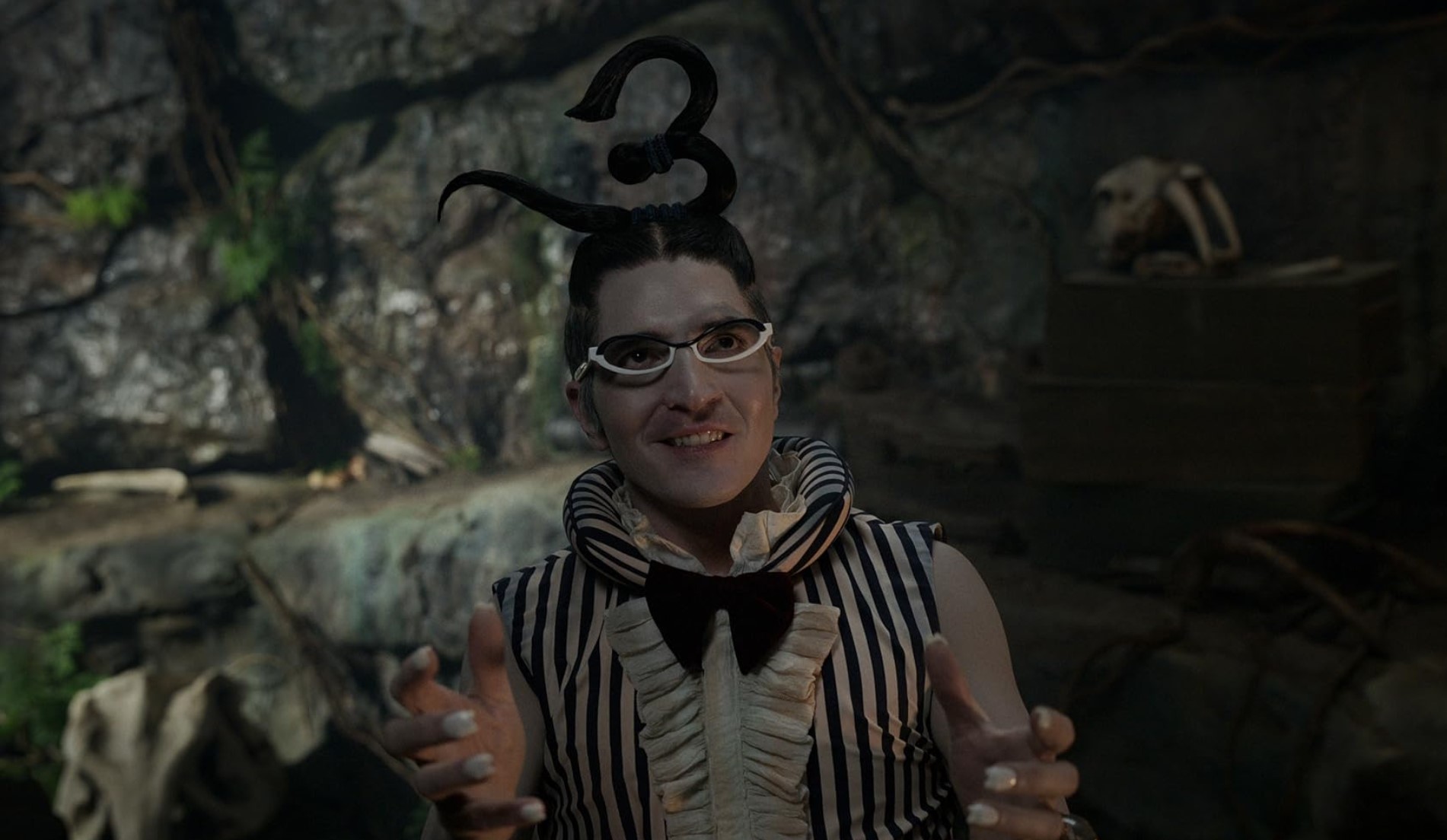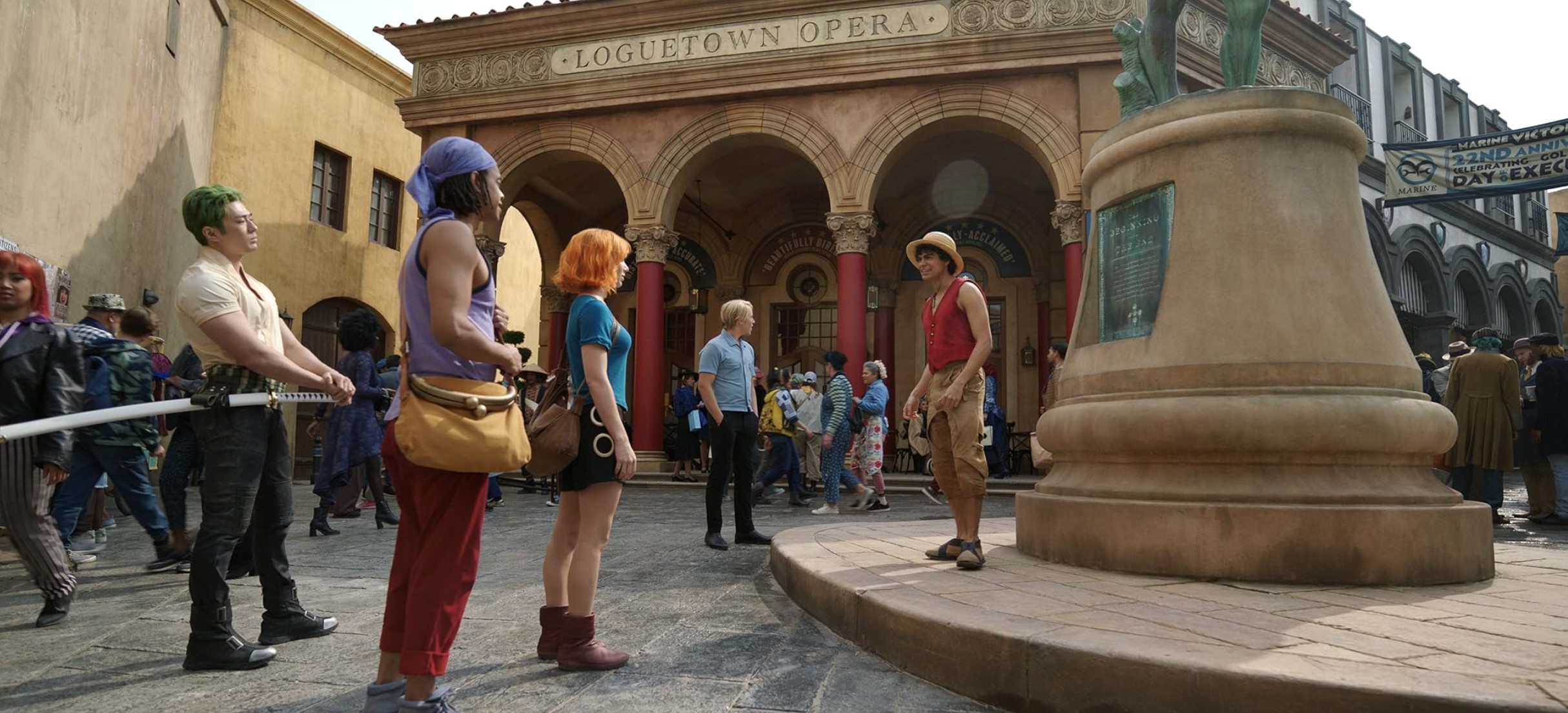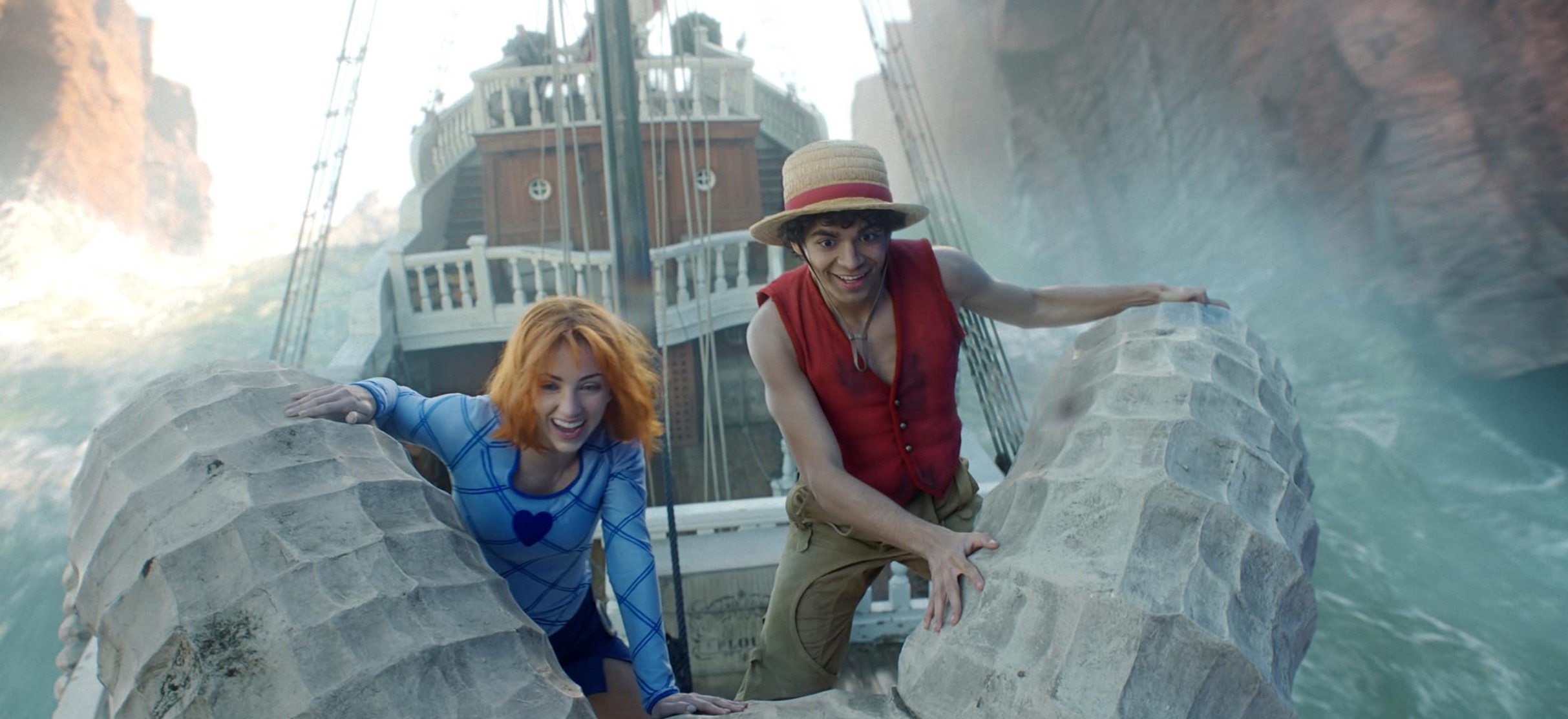 Cette sensation sera d’ailleurs régulière, tant les affrontements manquent de punch (contre Alvida), de temps (contre les membres de Baroque Works) ou tout simplement de moyens. A ce sujet, il est également décevant de constater une fois de plus ce grand écart entre les plans en CGI fourmillant de détails et les décors en dur ressemblant davantage à des lands de Disneyland et n’arrivant jamais à reproduire l’impression de grandeur des plans d’ensemble. Etrange, tout comme la gestion des vfx qui me fait dire que les producteurs ont sciemment choisi de ne pas trop en faire avec Luffy pour des raisons de coûts et d’efficacité. Malheureusement, là où dans le manga et l’anime, la nature exubérante de Luffy ressort énormément à travers l’utilisation quasi constante de ses pouvoirs, ne serait-ce que pour se mouvoir, le fait que son homologue IRL ne les utilise pratiquement jamais hors combat force l’acteur Iñaki Godoy à surjouer et à exagérer toutes ses émotions pour se rapprocher de son modèle animé. La méthode est louable mais accentue cet aspect kitsch et dérangeant qu’on retrouve à nouveau chez d’autres personnages aux maquillages très marqués ou certains éléments du lore (les Escargophones, toujours eux !). On en vient déjà à imaginer ce que va donner la suite de l’aventure. L’excentricité des personnages (dans leurs designs, leurs capacités) allant crescendo, de même que les pouvoirs de Luffy (vivement les Gear 4 & 5), tout ceci risque d’être très difficile à adapter sans exploser le compteur de cringe.