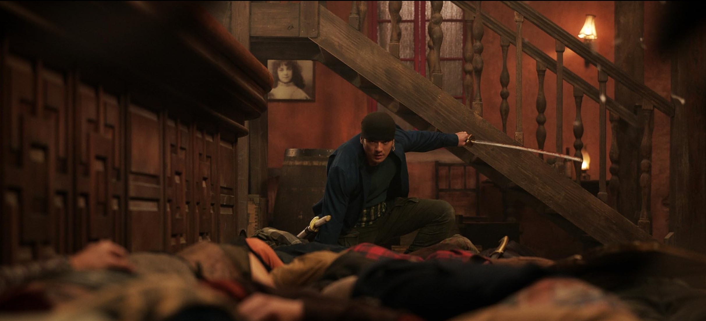 La structure du manga et de l’anime, voyant les membres équipage dispersés à chaque nouvel accostage, se répercute donc logiquement sur celle de la série Live. Ce n’est pas un mal, bien au contraire, puisque de cette façon, les compagnons de Luffy gagnent en profondeur ou auront tout simplement droit à leur instant de gloire dans diverses séquences d’action. Toutefois, comme je le précisais plus haut, le tout ne se fait pas sans quelques sacrifices. Zoro, par exemple, obtient ici deux sabres extrêmement importants pour lui qui ont droit dans la série à leur propre histoire, faisant de ces objets bien plus que de simples coupe choux. Chez Netflix, le tout est emballé en quelques dialogues et si la «séquence du bras» est bien entendu conservée, l’ensemble manque tout simplement d’âme. Quelques instants plus tard, ce même Zoro aura également le droit à un affrontement contre 100 pirates. Evoquant le cinéma hong-kongais des années 80, ou, au choix, Kill Bill Volume 1, la promesse d’une baston homérique fait saliver. Malheureusement, on en ressort quelque peu déçu, la chorégraphie et réalisation très plate n’étant jamais à la hauteur de ce que nous étions en droit d’attendre.