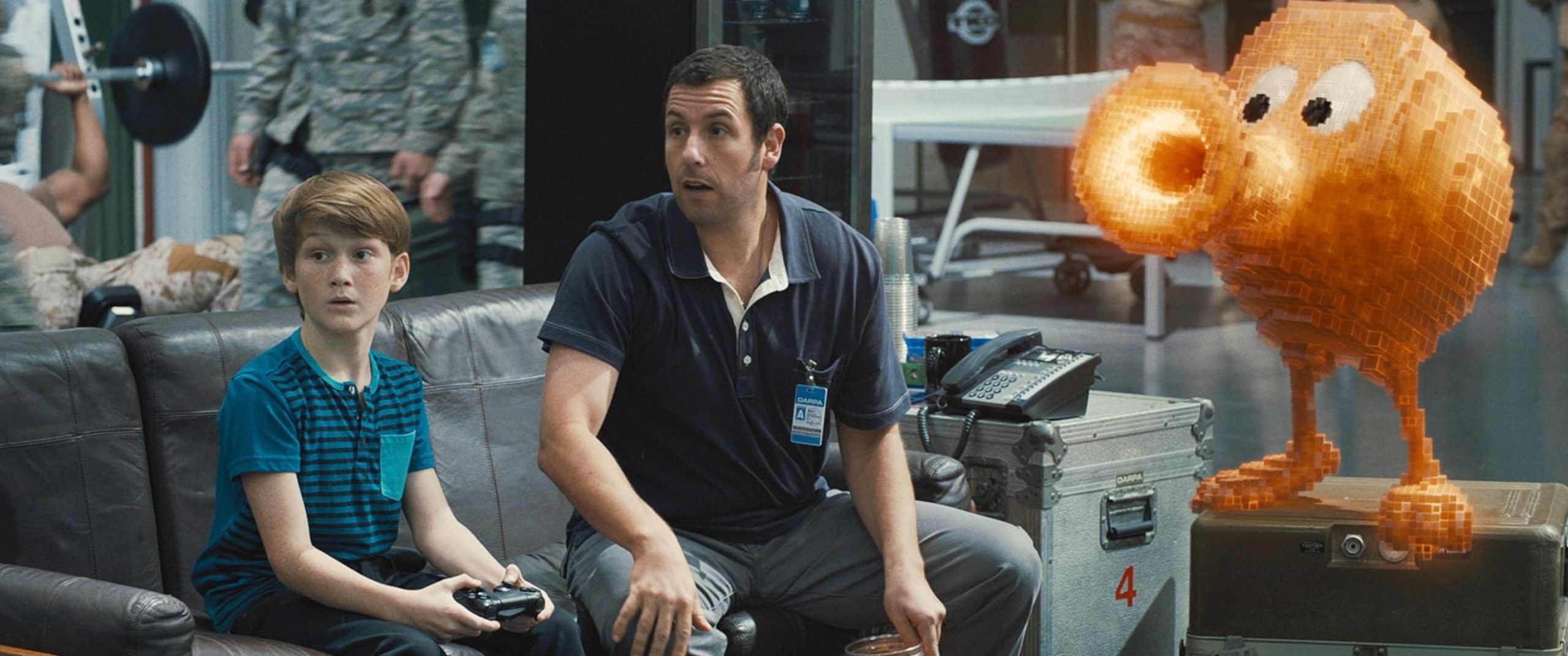 Les moyens employés pour faire passer le message dénotent surtout d’une méconnaissance du média à l’image de cette scène où Sam et Q*Bert discutent avec Matty en train de jouer à un jeu vidéo. Sandler lance alors au jeune garçon qu’il ne comprend rien aux jeux vidéo actuels qui n’ont pas de paterns précis à comprendre et qui sont surtout trop violents. Le hic est que le jeu vidéo qu’on voit alors tourner n’est autre que The Last of Us, jeu résolument adulte et mondialement reconnu pour ses qualités scénaristiques. Colombus choisit néanmoins de n’en montrer que des scènes d’action ou comment réduire un chef-d’oeuvre à un simple shooter à destination d’adolescents passifs qui ont depuis longtemps absorbé cette violence. On ne cessera alors d’osciller entre clichés sur les jeux vidéo actuels, stéréotypes issus des comédies des années 80 (à l’image des Goonies ou, plus proche de nous, Super 8) et références vidéoludiques provenant des eighties qui n’ont finalement que peu d’impact sur l’intrigue à l’exception de la course-poursuite avec Pac-Man. Malheureusement, l’un des climax du film, durant lequel apparaît Toru Iwatani, le créateur du personnage, perd de sa saveur, le tout ayant été dévoilé en amont dans les différents trailers. De plus, on ne pourra s’empêcher de penser à la séquence finale de Ghostbusters avec son Bidendum Chamallow, la comparaison n’allant malheureusement pas à l’avantage du film de Columbus.