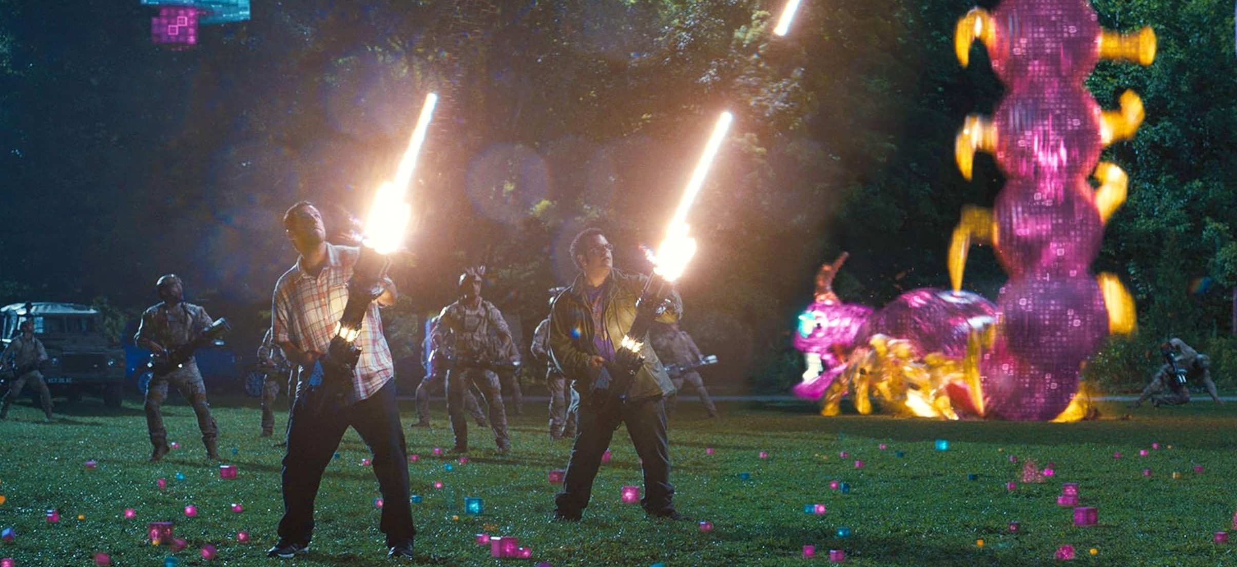 Si l’invasion extraterrestre a maintes et maintes fois été au centre de plusieurs longs-métrages, la traiter via le prisme du jeu vidéo reste pour le moins original. Ainsi, le film débute en 1982, alors que Sam Brenner et son copain grassouillet Will Cooper, découvrent les jeux vidéo via les premières bornes d’arcade sur le marché. Très vite, Sam montre un véritable attrait pour le média d’autant qu’il semble avoir un don pour analyser les patterns des ennemis, cette compétence lui étant bien utile pour terminer haut la main Defender, Pac-Man ou bien encore Galaga. Ceci lui permet alors de participer au Championnat du monde des jeux vidéo d’arcade où il finira malheureusement second lors d’un affrontement sur Donkey Kong. Les aléas de la vie qui n’empêchent pas les organisateurs, avec l’aide de la NASA, de lancer dans l’espace une capsule avec notamment des vidéos de l’événement. Malheureusement, des extraterrestres interceptent le message et le prennent pour une déclaration de guerre, ceci débouchant 30 ans plus tard sur une guerre ouverte entre E.T., prenant la forme des personnages de jeux vidéo, et des humains incrédules face à cette situation pour le moins étonnante. C’est sous couvert de ce pitch peu cohérent (pourquoi les E.T. se transforment en icônes de jeux vidéo si ils les prennent à la base pour une menace ?) que le film peut réellement débuter. Will Cooper est devenu président des USA (rien de moins) alors que Sam se contente d’installer du matériel vidéo dans les foyers de la middle class américaine. Les deux ne tarderont pas à se retrouver pour lutter ensemble contre la menace alien.