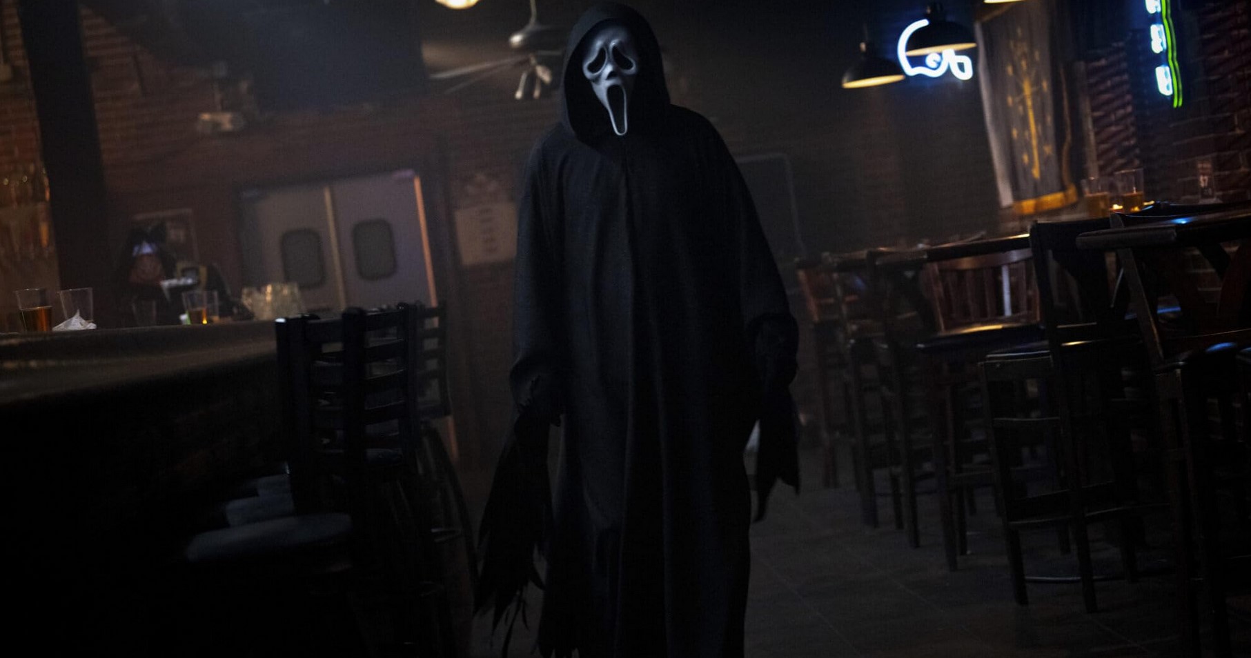 D’ailleurs, elle aura été bien inspirée de parer à toute éventualité puisque comme de coutume, un nouveau Ghostface ne tardera pas à pointer le bout de son masque, bien décidé à trucider la belle et tout son entourage. Ici aussi le bat blesse, tant les personnages gravitant autour de Sid sont simplement dévolus à incarner le(s) potentiel(s) tueur(s) et, bien sûr, à servir de chair à canon pour des meurtres, cette fois plus inventifs. Sur ce point, Williamson se fait plaisir. Tripes à l’air, meurtre dans un théâtre qu’on croirait issu d’un giallo, un autre à base de tireuse à bières dans la grande veine des slashers des années 80, Scream 7 s’avère étonnamment réjouissant de ce point de vue en multipliant les idées, hélas contrebalancées par une construction des plus convenues.